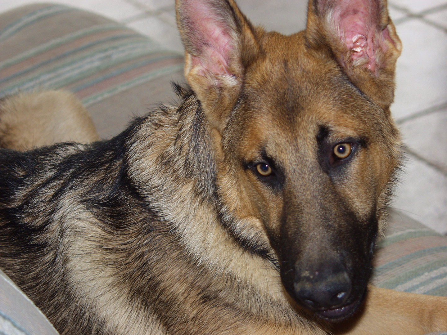 His head has a gold velvet pillow between the ears which as they stood first so long ago as large as they are now on the head still yet 3 months old were like satellite dishes as they caught the noises of his world as he learned them.