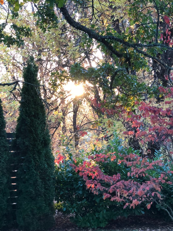 The day dawned as I stood outside with Zoi and Corgiette and Oldest. The sun disced through the middle of Mother Oak before she shone her light across the ground. And slowly she lit the world as puppy chased the other.
