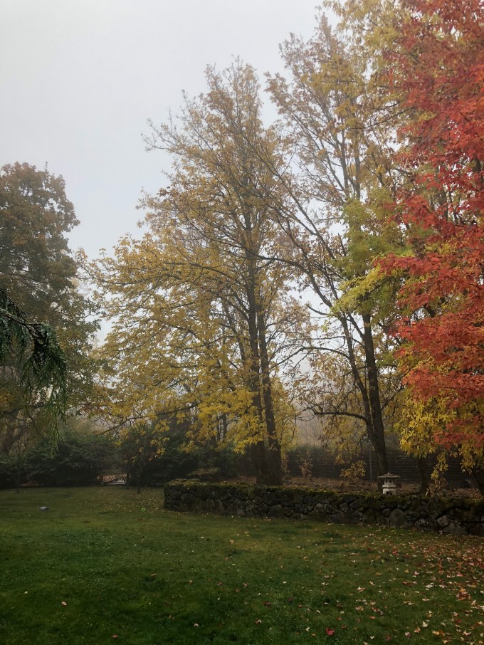 The pack stirred slowly. The Continent appeared beside me baring his incredible grin and I responded with a smile and a pat. Then rose to don my pajama pants and robe and old smelly slippers. Picked up the Duckle Boy who doesn’t stair and strode towards the downward path trailing Continent, Dragon, Wizard and The Zoi who all stood at the top of the stairs until I sent them down before me. Opened the big wooden door to stoop which framed the multicolored iridescent carpet of the evening fall of leaves. The yard was glowing with that inner light which bursts from colors in the aura of the fog. Quiet drizzle and swish of paws through leaves, the music of the moment.