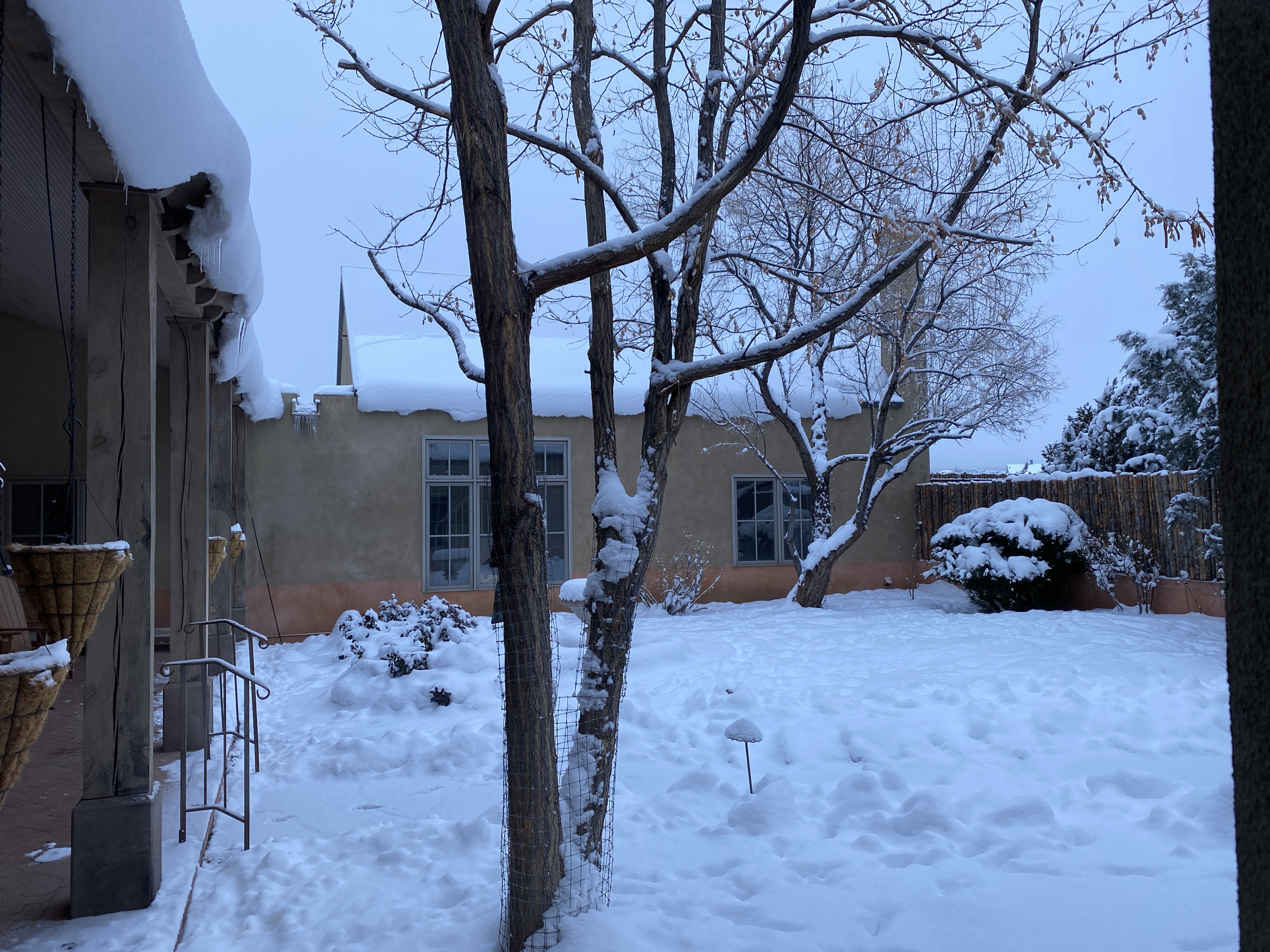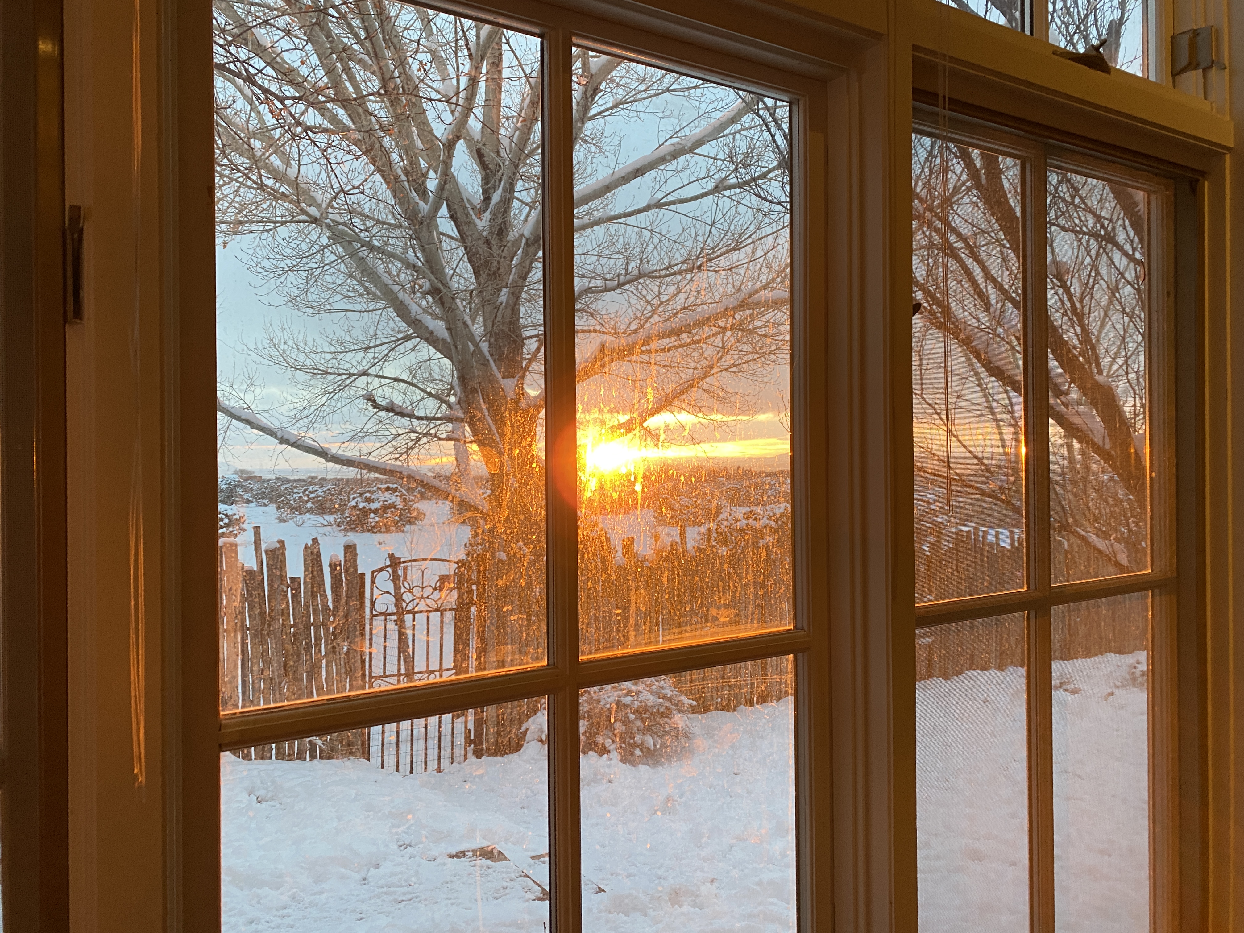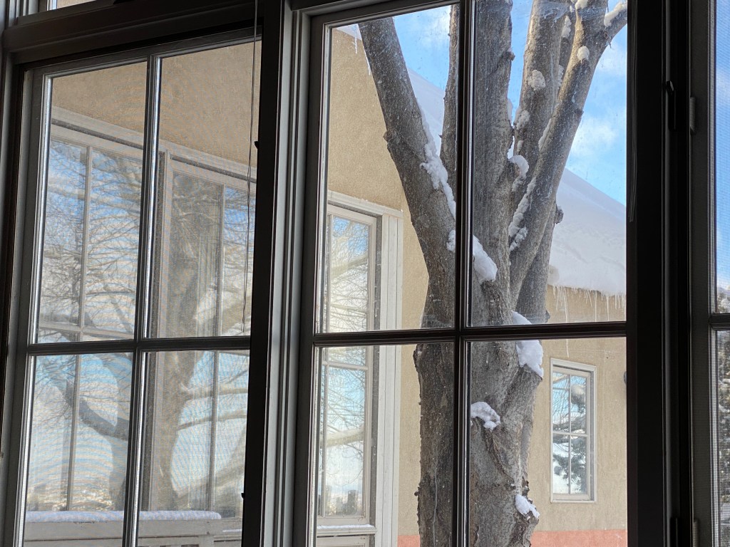 Three days today and the sun is out. The canales dripping the release of the frozen rooftops burden. The slips of branches and lovely and stilling as it is, snow’s nature is impermanence at least in these latitudes for now. Warmth’s alchemy sends water flowing earthbound sourcing sleeping bounty coming in the spring.